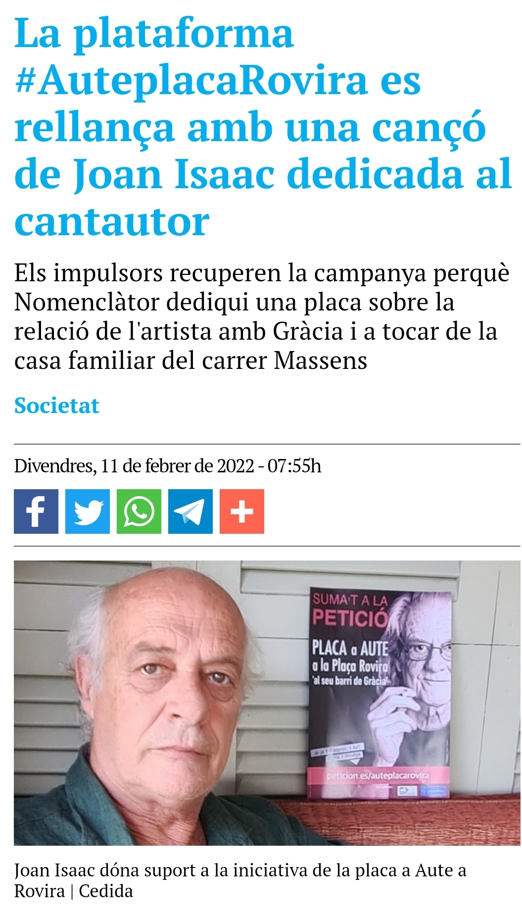Adjunto nota publicada hoy 9 de julio de 2021 en el semanario del barrio de Gracia, informando de la adhesión de Cope Gutiérrez a la plataforma cívica #auteplacarovira y de su visita a la plaza.